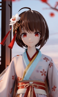 artist mmd,1girl,solo,red eyes,looking at viewer,hair ornament,short hair,upper body,brown hair,blurry,ahoge,bangs,chinese clothes,see-through,depth of field,hanfu,smile,floral print,closed mouth,