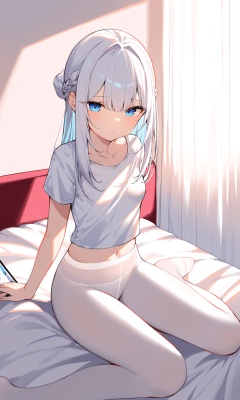 masterpiece, best quality,backlight,Tyndall effect,Crepuscular Rays, 1girl,((white_hairbangs)),long hair,French braid,blue eyes,cold expression,white T-shirt,White pantyhose,navel,sit,small_breasts,No shoes on, bedroom,White cloth sofa,White blanket,Dieffenbachia seguine Schott,White curtains, ipad,