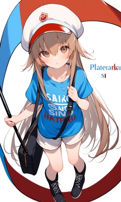 1girl, platelet (hataraku saibou), solo, hat, long hair, brown eyes, brown hair, shirt, blue shirt, looking at viewer, flat cap, boots, flag, white background, blush, short sleeves, simple background, bag, holding, black footwear, hair between eyes, holding flag, shorts, white headwear, shoulder bag, parted lips, bangs, from above, clothes writing, character name, very long hair, full body, collarbone