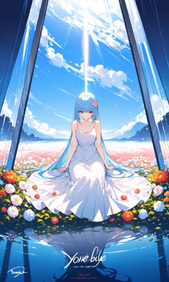 best quality,masterpiece,illustration,(reflection light),incredibly absurdres,(Movie Poster),(signature:1.3),(English text:1.3),1girl,girl middle of flower,pure skyblue hair,red eyes,clear sky,outside,collarbone,sitting,absurdly long hair,clear boundaries of the cloth,white dress,fantastic scenery,ground of flowers,thousand of flowers,colorful flowers,flowers around her,various flowers,