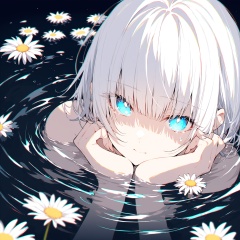 best quality,(chromatic aberration),(beautiful young female:1.4),(streaming tears),sad,(daisy),(daisy),(daisy),looking at viewer,partially submerged,both hands on own cheek,{see-through long shirt},{no bra},(white hair, short hair, bangs:1.2),(glowing eyes),ripples,dark water,black background,(prismatic),
