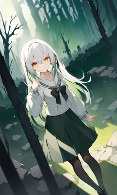 dark,dark,dark,finely detail,Depth of field,(((masterpiece))),((extremely detailed CG unity 8k wallpaper)),best quality,high resolution illustration,Amazing,intricate detail,(best illumination, best shadow, an extremely delicate and beautiful),dramatic angle,long-focus,A rich color,darkgreen tone,darkgreen tone,(ruins),(ruins),(ruins),chowbie_jue,bangs,black_bow,black_pantyhose,black_skirt,blurry,blurry_background,braid,bow,brown_eyes,grey_hair,hair_between_eyes,hair_bow,hand_up,highres,legs,long_hair,long_sleeves,looking_at_viewer,original,pantyhose,pleated_skirt,puffy_long_sleeves,puffy_sleeves,sailor_collar,shirt,skirt,solo,standing,white_sailor_collar,white_shirt,(forest),(((Tyndall effect))),(((dense))),((fog)),((God's light)),(((backlight))),((light leaks)),((Airborne dust)),((white hair)),long hair,young,((small breast)),