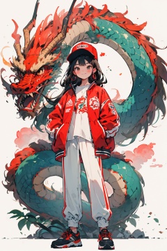 national tide,1girl, eastern dragon, dragon, red headwear, pants, long hair, hands in pockets, shirt, red jacket, black hair, solo, white shirt, shoes, jacket, hat, looking at viewer, full body, sneakers, long sleeves, white background, standing, smile, blush, brown eyes, earrings, closed mouth, puffy long sleeves, simple background, bangs, black eyes, open jacket