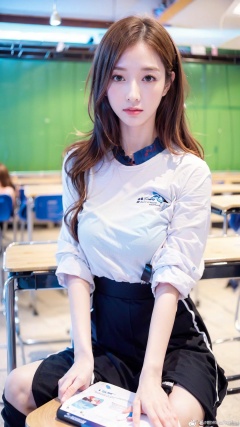 The image features a beautiful anime girl with blue hair, dressed in a school uniform. She is sitting on a desk in a classroom setting, with a book on her lap and a pencil in her hand. Her gaze is directed towards the camera, and her expression is one of curiosity and determination.