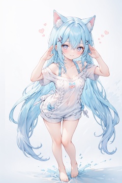 petite, loli, solo, animal ears, heart, puffy short sleeves, blue hair, long hair, off shoulder, bangs, hair ornament, gradient background,rainbow gradient, x hair ornament, animal ear fluff, looking at viewer, very long hair, blush, smile, cat ears, bare shoulders, collarbone, hand up, gradient sweater, hair between eyes, symbol-shaped pupils, arm up, heart-shaped pupils, hairclip, medium breasts, salute, bare legs,full body