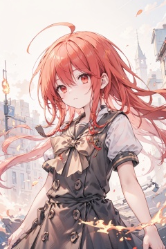 best quality,(masterpiece:1.3),cowboy shot,ultra-detailed,solo:1.3,shanahelical_visible_aura full of background,burning aura,floating hair,floating fire,heat wave,fire devil,ahoge,Bright red and fiery red hair,long hair,red eyes,school uniform <lora:shana (Shakugan no Shana) 夏娜(灼眼的夏娜)_v1.0:1>