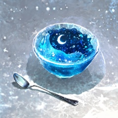 <lora:star_xl_v1:1>,The image showcases a glass bowl filled with a vibrant blue liquid. The liquid appears to be frozen, with a swirling pattern that gives it a galaxy-like appearance. Within the liquid, there are tiny white specks that resemble stars. At the top of the bowl, there's a crescent moon and a few stars, suggesting a night sky theme. The bowl is placed next to a silver spoon., glass bowl, vibrant blue liquid, frozen, galaxy-like appearance, tiny white specks, crescent moon, stars