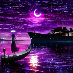<lora:star_xl_v1:1>,The image portrays a serene nighttime scene by a body of water. The sky is painted with hues of purple, blue, and a crescent moon. The water reflects the colors of the sky and the lights from the ship. On the left, a silhouette of a girl stands by the water's edge, gazing at the ship. She wears a dress and has a glowing headpiece. The ship, illuminated with lights, appears to be a large vessel with multiple decks. The entire scene is bathed in a magical ambiance, with sparkles and particles floating in the air, adding to the dreamy atmosphere., body of water, sky, crescent moon, water, ship, girl, dress, headpiece, decks, magical ambiance, sparkles, particles