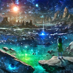 <lora:star_xl_v1:1>,The image portrays a surreal and vibrant cosmic scene. Dominating the center is a radiant blue celestial body, possibly a star or a planet, surrounded by a myriad of stars, nebulae, and other cosmic elements. Above this, there's a vast expanse of space filled with stars, and a few celestial bodies, including a moon or planet, can be seen. The foreground features a landscape that appears to be a mix of rocky terrain and water. There are two figures in the foreground: one is a child with a glowing green aura, standing on a rock, and the other is a small creature with a greenish hue, floating near the water. The entire scene is bathed in a soft, ethereal light, creating a dreamlike atmosphere.