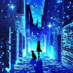 <lora:star_xl_v1:1>,The image portrays a serene and dreamlike urban setting at night. A narrow alleyway, bordered by old buildings, is illuminated by a soft blue glow, possibly from the moon or some other celestial body. The alley is adorned with floating star-like particles, giving it a magical ambiance. In the foreground, a silhouette of a girl stands with her back to the viewer, holding a dog by its leash. The girl appears to be gazing into the distance, possibly lost in thought. The overall mood of the image is contemplative and ethereal, with the blend of natural and urban elements creating a sense of wonder., serene, dreamlike, urban setting, narrow alleyway, old buildings, soft blue glow, star-like particles, girl, dog, silhouette, thought, wonder
