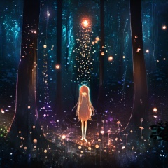 <lora:star_xl_v1:1>,The image portrays a mystical and ethereal forest scene at night. The forest floor is illuminated by a myriad of glowing orbs, some of which resemble fireflies, while others have a more luminescent quality. These orbs cast a soft, radiant light that contrasts with the darker shadows of the trees and foliage. In the center of the image, there's a tall, glowing figure with long, flowing hair, standing amidst the orbs. The figure appears to be made of a translucent material, allowing the light to pass through it. The overall ambiance of the image is serene, magical, and otherworldly., forest, nocturnal, glow, orbs, fireflies, radiant light, glowing, luminescent, figure, translucent, ambiance