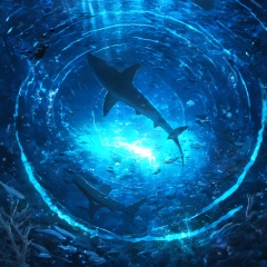<lora:star_xl_v1:1>,The image portrays a mesmerizing underwater scene, illuminated by a radiant blue glow. A large, circular halo-like structure emits a soft light, casting a luminous pathway through the water. Various marine life, including sharks, fish, and other aquatic creatures, swim around the halo, seemingly drawn to its light. The water's surface is scattered with debris, including broken ropes and other underwater artifacts. The overall ambiance of the image is ethereal, with the blue hue giving it a dreamy and otherworldly feel.