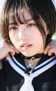 mugglelight, an asian woman with a black tie and a white shirt, 1girl, collar, sailor collar, solo, black hair, looking at viewer, upper body, teeth, short hair, school uniform, leash, strangling, serafuku, shirt, solo focus, bangs, hand on own neck, black sailor collar