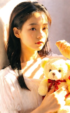 mugglelight, there is an asian woman holding a teddy bear in her hand, 1girl, solo, looking at viewer, food, sunlight, fruit, black hair, backlighting, holding, brown eyes, holding food, upper body,
