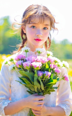 mugglelight, there is a young girl holding a bouquet of flowers in her hands, solo, 1girl, flower, looking at viewer, brown hair, portrait, blue eyes,