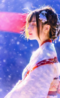 mugglelight, there is an asian woman in a kimono with a red sash, 1girl, solo, closed eyes, japanese clothes, kimono, black hair, upper body, ribbon, hair ribbon, hair ornament, bangs, white kimono, from side, blurry, closed mouth, sash, short hair, eyelashes,