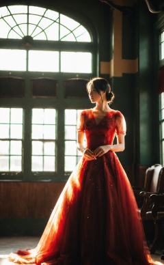 mugglelight, a woman in a red gown, posing in a vintage train station with sunlight streaming through the windows, romantic atmosphere, classic allure, cinematic lighting.korean girl,black hair,