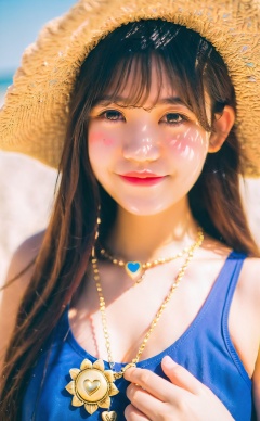 mugglelight, araffe girl with long hair wearing a straw hat and blue dress, 1girl, solo, hat, straw hat, long hair, looking at viewer, necklace, jewelry, heart necklace, smile, heart, brown hair, bangs, day, beach, outdoors, upper body, black hair, sunlight, closed mouth, swimsuit, selfie, sky, ocean, sun hat