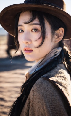 Classic western gunslinger, captured with cinematic excellence, standing in the dust of a deserted town, detailed face reflecting the hardships of a rugged life in the Old West.korean girl,black hair,mugglelight,