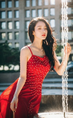 mugglelight, a woman in a red dress, posed near a city fountain with water droplets catching the sunlight, urban glamour, playful elegance.korean girl,black hair,