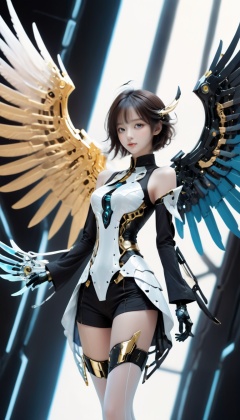 <lora:xl-shanbailing-0112yin_yang:0.9>,(1girl:1.2),wings,(solo:1.2),color patches,left and right different colors,contrast,with a futuristic wing,mechanical wings,wings,science fiction,eyeshadow,single mechanical arm,gloves,mecha musume,cowboy shot,left black right white,black,gold,silk stockings,