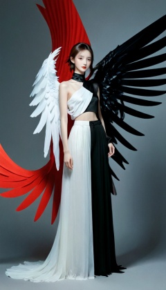 <lora:xl-shanbailing-0112yin_yang:0.8>,(1girl:1.2),wings,(solo:1.2),left and right different colors,color patches,contrast,concept clothing,garment draping,black,red,