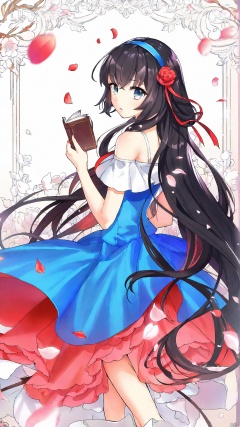 1girl, solo, long hair, looking at viewer, black hair, dress, flower, hairband, looking back, book, petals