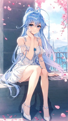 1girl, solo, long hair, looking at viewer, smile, bangs, blue eyes, dress, bare shoulders, sitting, very long hair, closed mouth, blue hair, collarbone, full body, off shoulder, white dress, high heels, petals, white footwear, antenna hair, hand on own face, off-shoulder dress
