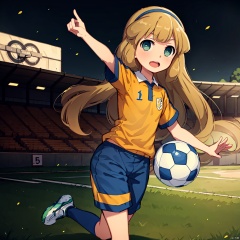 masterpiece, best quality, 1girl, loli, nanobana kinako, solo,  long hair,  open mouth,  blonde hair,  green eyes,  hairband,  ball,  sportswear,  soccer uniform,  lightning bolt symbol,  soccer ball,  raimon,  soccer,  telstar,  raimon soccer uniform, day, Football Field, Kick a ball,<lora:EMS-264108-EMS:0.800000>