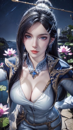 masterpiece,best quality,official art,extremely detailed CG unity 8k wallpaper,realistic,light rays,light particles,1girl,solo,hand_on_hip,fur_trim,thighhighs,midriff,breasts,navel,standing,boots,jewelry,cleavage,medium chest,blue theme,scenery,reflection,outdoors,(lotus leaf:1.1),(lotus:1.1),lake water,blue sky,white cloud,waterfall,long_hair,earrings,hair_ornament,dynamic pose,looking at viewer,