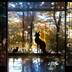 <lora:star_xl_v2:1>,a cat sitting on a window sill looking out at the outside of the window with the cat in the window, 1girl, solo, animal ears, standing, tail, japanese clothes, water, from behind, tree, fox ears, fox tail, leaf, sunlight, scenery, reflection, silhouette, sliding doors, sitting, shadow, grass, The image showcases a serene and dreamlike scene set against a backdrop of a forest. A silhouette of a person, possibly a girl, stands in the center, holding a fox-like creature by its tail. The person is dressed in a long dress and appears to be gazing into the distance. The forest is illuminated by a soft, golden light, and there are various elements like leaves, branches, and possibly fireflies scattered throughout. The image is framed by a window or sliding door on the left, which has a grid pattern. The entire scene is overlaid with a myriad of abstract shapes, stars, and patterns, giving it a magical and ethereal quality., serene, dreamlike, forest, fox-like creature, dress, gaze, grid pattern, magical, ethereal