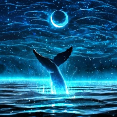 <lora:star_xl_v2:1>,a whale jumping out of the water at night with stars and a crescent above it and a crescent of stars above it, outdoors, sky, water, no humans, night, animal, moon, star \(sky\), night sky, scenery, starry sky, reflection, fish, blue theme, crescent moon, whale, The image showcases a breathtaking nighttime scene over a body of water. Dominating the foreground is a majestic whale, its tail raised high, seemingly leaping out of the water. The whale is illuminated with a radiant blue glow, contrasting beautifully against the dark backdrop. Above the whale, the sky is awash with a myriad of stars, forming intricate patterns and trails. A crescent moon hangs in the sky, adding to the ethereal ambiance. The water below reflects the stars and the moon, creating a mirror-like effect. The overall mood of the image is one of wonder, serenity, and the beauty of nature., body of water, nighttime scene, stars, trails, ethereal ambiance, wonder
