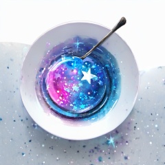 <lora:star_xl_v2:1>,a bowl with a spoon inside of it with a star design on it and a spoon in the bowl, simple background, white background, food, sky, no humans, fruit, star \(sky\), plate, starry sky, spoon, food focus, still life, dessert, galaxy, night sky, reflection, saucer, The image showcases a bowl containing a gelatinous substance that has been artistically designed to resemble a galaxy. The substance is vibrant with hues of blue, purple, and pink, with shimmering specks that mimic stars. A spoon is placed next to the bowl, suggesting that the substance is ready to be consumed. The background is plain white, which accentuates the vivid colors of the galaxy-like substance., bowl, gelatinous substance, hues of blue, pink, shimmering specks, background