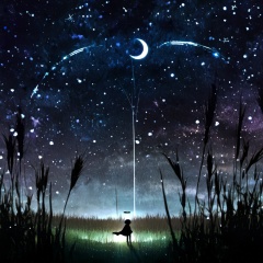 <lora:star_xl_v2:1>,a person standing in a field under a night sky filled with stars and a crescent moon above them, with a person standing in the foreground, solo, 1boy, standing, outdoors, sky, cloud, tree, night, moon, grass, star \(sky\), nature, night sky, scenery, starry sky, silhouette, dark, crescent moon, 1girl, long hair, from behind, shooting star, The image showcases a breathtaking cosmic scene where a vast expanse of the universe is visible. The sky is filled with a myriad of stars, nebulae, and a crescent moon. A silhouette of a person stands in the foreground, gazing up at the celestial display. The person appears to be holding a small object, possibly a telescope or a camera, capturing the moment. The ground is covered with tall grasses, and the overall ambiance of the image is serene and awe-inspiring., cosmic scene, vast expanse of the universe, silhouette of a person, telescope, camera, grasses, ambiance
