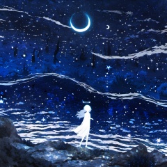 <lora:star_xl_v2:1>,a painting of a girl standing on a hill with a moon and stars in the sky above her head, 1girl, solo, dress, standing, outdoors, sky, water, white dress, night, glowing, halo, moon, star \(sky\), night sky, scenery, starry sky, silhouette, crescent moon, pillar, long hair, floating, blue theme, fantasy, The image portrays a serene nighttime scene with a silhouette of a female figure standing on a rocky terrain. She has a halo around her head, suggesting a celestial or ethereal nature. The sky is filled with stars, and there's a crescent moon visible in the top right corner. Above her, there are fish swimming in the vast expanse of the cosmos. The entire scene is bathed in a deep blue hue, giving it a dreamy and otherworldly ambiance., serene nighttime scene, silhouette of a female figure, halo around her head, stars, rocky terrain, fish swimming, deep blue hue