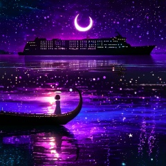 <lora:star_xl_v2:1>,a person standing on a beach next to a large ship at night with a full moon in the sky, 1girl, solo, short hair, dress, standing, outdoors, sky, cloud, water, night, halo, moon, star \(sky\), night sky, scenery, starry sky, crescent moon, building, reflection, city, fantasy, city lights, The image portrays a serene nighttime scene by a body of water. The sky is painted with hues of purple, blue, and a crescent moon. The water reflects the colors of the sky and the lights from the ship. On the left, a silhouette of a girl stands by the water's edge, gazing at the ship. She wears a dress and has a glowing headpiece. The ship, illuminated with lights, appears to be a large vessel with multiple decks. The entire scene is bathed in a magical ambiance, with sparkles and particles floating in the air, adding to the dreamy atmosphere., body of water, ship, girl, headpiece, decks, magical ambiance, sparkles, particles