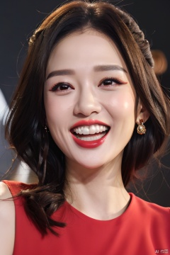 1woman,portrait,looking at viewer,makeup,lipstick,open mouth,smile,teeth,chenqiaoen