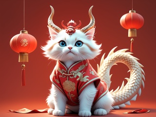 no humans,lantern,chinese new year,animal focus,dragon,eastern dragon,full body,chinese clothes,horns,blue eyes,cat,red background,a festive atmosphere,<lora:龙年小猫写真:0.3>,
