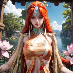 masterpiece,best quality,official art,extremely detailed CG unity 8k wallpaper,realistic,light rays,light particles,1girl,solo,red_hair,long_hair,breasts,jewelry,dress,medium chest,blue theme,scenery,reflection,outdoors,lotus leaf,(lotus:1.3),lake water,blue sky,white cloud,long_hair,earrings,hair_ornament,hairpin,dynamic pose,looking at viewer,chinese_clothes,