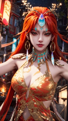 masterpiece,best quality,official art,extremely detailed CG unity 8k wallpaper,realistic,light rays,light particles,1girl,solo,red_hair,long_hair,breasts,jewelry,dress,medium chest,flame,rubble_ruins,night,starry_sky,long_hair,earrings,hair_ornament,hairpin,dynamic pose,looking at viewer,chinese_clothes,