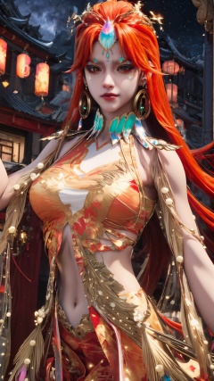masterpiece,best quality,official art,extremely detailed CG unity 8k wallpaper,realistic,light rays,light particles,1girl,solo,red_hair,long_hair,breasts,jewelry,dress,medium chest,flame,rubble_ruins,night,starry_sky,long_hair,earrings,hair_ornament,hairpin,dynamic pose,looking at viewer,chinese_clothes,