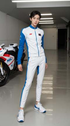 1 boy,in the tunnel,white racing suit,35mm,asian face,delicate features,studio lighting,white sneakers,nike shoes,muscular,slim figure,black hair,blue eyes,tall and thin,motorcycle,race car,supercar,