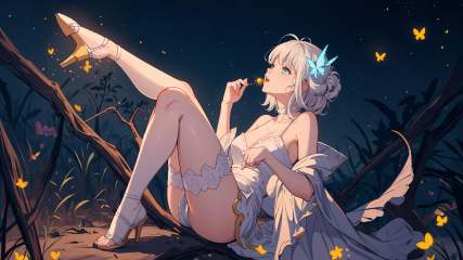 ((masterpiece)),((best quality)),8k,high detailed,ultra-detailed,Cinematic textures. Cinematic compositions. Cinematic lighting effects.rounded corners,A girl,wearing a diaphanous gown,High heels,looking up,full body,sexy,Enjoy,giggle.Blue theme,alluringly innocent,in a dreamlike setting,((ethereal beauty)),((enchanted aura)),surrounded by ((glistening fireflies)),((softly glowing moonlight)),((whimsical butterflies)).,