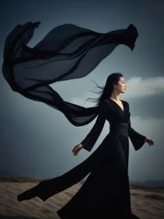 A woman facing the wind with a black theme,exuding a mysterious Eastern romance,woman,facing wind,(black theme),mysterious ambiance,(Eastern romance),flowing attire,