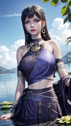 masterpiece,best quality,official art,extremely detailed CG unity 8k wallpaper,realistic,light rays,light particles,1girl,earrings,solo,jewelry,black_hair,long_hair,upper_body,blue_eyes,blue_ribbon,armlet,breasts,blue theme,scenery,reflection,outdoors,lotus leaf,(lotus:1.3),lake water,blue sky,white cloud,long_hair,earrings,hair_ornament,dynamic pose,looking at viewer,cowboy shot,