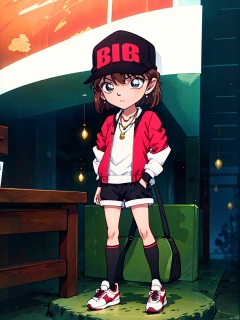 masterpiece,best quality,UHD,hat, jewelry, jacket, full body,earrings, shoes, shorts, socks, necklace, bag, kneehighs,black socks, sneakers, hands in pockets, beanie, Anime