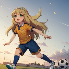 masterpiece,best quality,1girl,loli,nanobana kinako,solo, long hair, open mouth, blonde hair, green eyes, hairband, ball, sportswear, soccer uniform, lightning bolt symbol, soccer, raimon soccer uniform,day,play football,