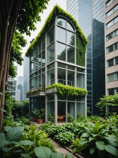 a lush little vintage house with garden squeezed inbetween two modern cold glass skyscrapers, extremely detailed, 8k, 35mm photograph, amazing natural lighting, brilliant composition