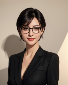 (upper body:1.2),glamor,(mature female:1.3),Black-rimmed glasses,low key,cleavage,(Skin granule:1.3),oval face,1girl,solo,(Face shadow:1.3),(black suit:1.5),Facial texture,shading of the nose,big eyes,white background,black hair,perfect face,Oval face,Seductive smile,upper body,best quality,masterpiece,realistic,ultra-fine painting,sharp focus,extreme detail description,realistic,masterpiece,1girl,(image noise:1.3),hair intakes,short hair,shoulder,
