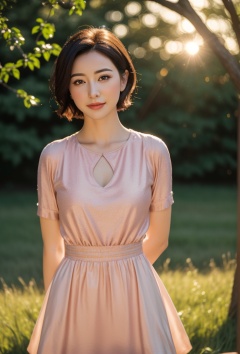 Ultra-realistic 8k,(closed mouth:1.2),(very cute:1.2),(masterpiece:1.2),(best quality:1.2),(photorealistic:1.4),HDR,absurdres,Professional,RAW photo,lens flare,(film grain:1.1),Bokeh,((Depth of field)),studio light,a woman in a dress,a pink bubbles,in front of a green field,1girl,black_hair,blurry,brown_eyes,dress,grass,lips,short_hair,solo,Highly detailed,Professional,extreme detail description;,shiny skin,heart-shaped face,